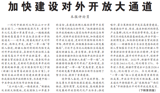 一列列中欧班列从阿拉山口口岸驶出国门,一辆辆新能源汽车、重型卡车从巴克图口岸鱼贯而出,一趟趟满载货物的集装箱卡车在红其拉甫口岸快速通关……近年来,随着我国扩大对外开放、西部大开发、共建“一带一路”等深入推进,新疆从相对封闭的内陆变成对外开放的前沿,在新时代新征程上奋力谱写高水平对外开放新篇章。建立新疆自贸试验区是党中央、国务院作出的重大决策,是新时代推进改革开放的重要战略举措,近日国务院印发《中国(新疆)自由贸易试验区总体方案》,方案的实施必将助力创建亚欧黄金通道和我国向西开放的桥头堡,为共建中国—中亚命运共同体作出积极贡献。(今日《人民日报》1版、2版)