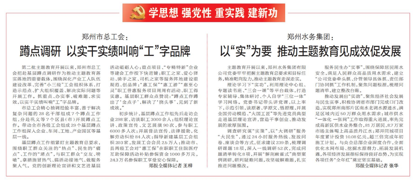 第二批主题教育开展以来,郑州市总工会把赴基层蹲点调研作为推动主题教育落实落地的重要载体,围绕深化产业工人队伍建设改革、完善“小三级”工会组织体系、打造示范点、扩大组织覆盖、解决实际问题等开展工作。抓重点、办实事、破难题、求实效,以实干实绩叫响“工”字品牌。(今日《郑州日报》2版)