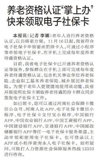 老年人进行养老资格认证,以后将更方便。11月16日起,我省符合电子社保卡申领要求的持卡人,可通过小程序等申领电子社保卡,在手机上完成每年度养老待遇资格认证。(今日《郑州日报》2版)
