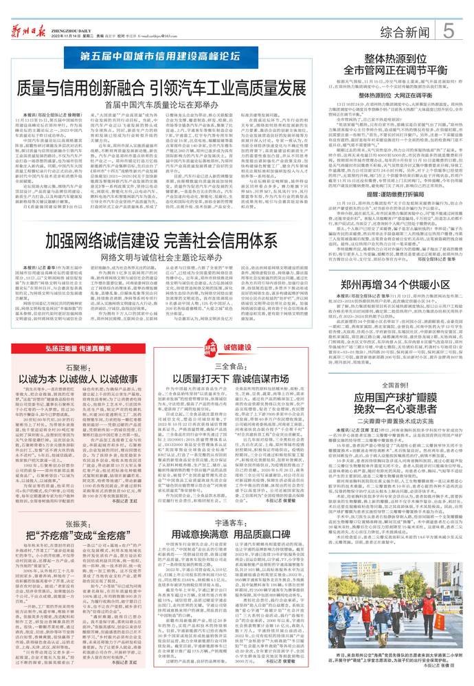 11月13日至15日,第五届中国城市信用建设高峰论坛在郑州举行。作为高峰论坛的主题论坛之一,2023中国汽车质量论坛于昨日成功举办。(今日《郑州日报》5版)
