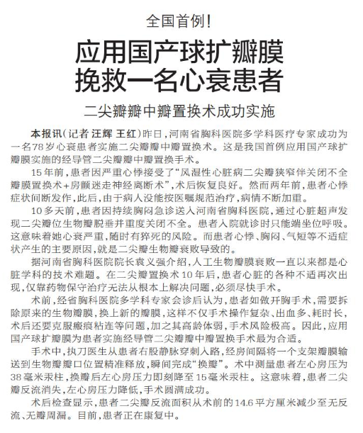 昨日,河南省胸科医院多学科医疗专家成功为一名78岁心衰患者实施二尖瓣瓣中瓣置换术。这是我国首例应用国产球扩瓣膜实施的经导管二尖瓣瓣中瓣置换手术。(今日《郑州日报》5版)