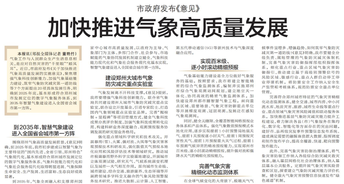 气象工作与人民群众生产生活息息相关,是应对自然灾害的“千里眼”“顺风耳”。近日,市政府发布《关于加快推进气象高质量发展的实施意见》,聚焦增强气象科技创新能力、加强气象基础能力建设、筑牢气象防灾减灾第一道防线等7个方面提出20项具体发展任务,明确到2025年底,基本形成符合郑州城市发展定位的数字气象服务体系,到2035年智慧气象建设进入全国省会城市第一方阵。(今日《郑州日报》6版)