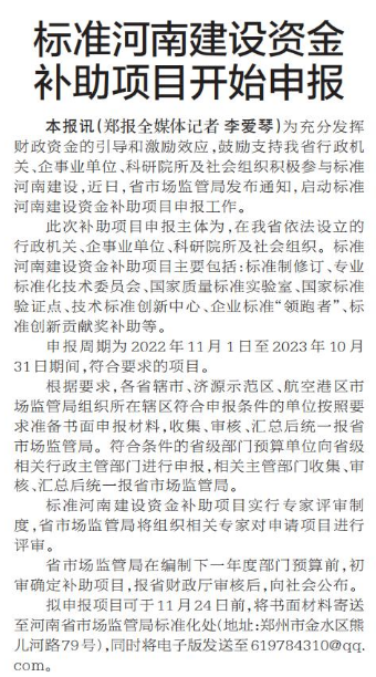 为充分发挥财政资金的引导和激励效应,鼓励支持我省行政机关、企事业单位、科研院所及社会组织积极参与标准河南建设,近日,省市场监管局发布通知,启动标准河南建设资金补助项目申报工作。(今日《郑州日报》6版)