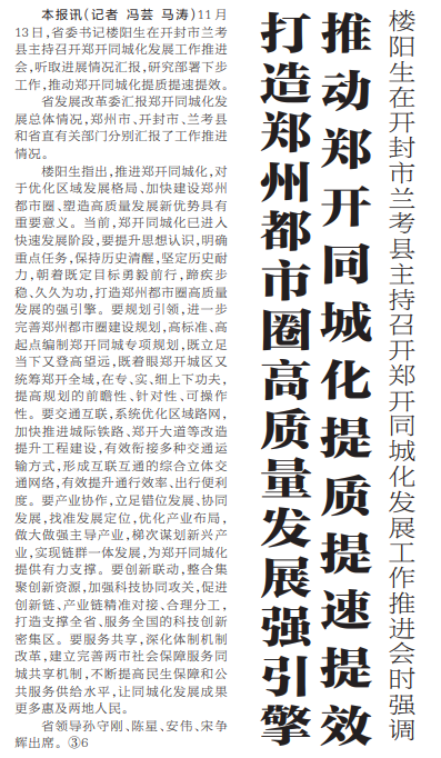 11月13日,省委书记楼阳生在开封市兰考县主持召开郑开同城化发展工作推进会,听取进展情况汇报,研究部署下步工作,推动郑开同城化提质提速提效。