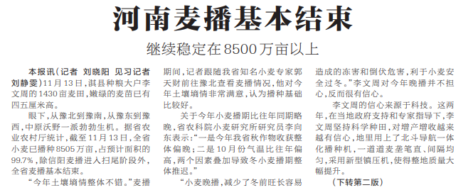 眼下,从豫北到豫南,从豫东到豫西,中原沃野一派勃勃生机。据省农业农村厅统计,截至11月13日,全省小麦已播种8505万亩,占预计面积的99.7%,除信阳麦播进入扫尾阶段外,全省麦播基本结束。(今日《河南日报》1版、2版)