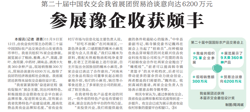 11月9日至12日,由农业农村部主办的第二十届中国国际农产品交易会在山东省青岛市举行。我省共组织75家企业参展,展览展示了粮油、畜禽、水产、果蔬、茶叶、食用菌、中药材、调味品、酒类9大类360余种产品,现场销售额300万元,贸易洽谈意向6200万元,取得了良好的经济效益和社会效益。我省展团还获得本届农交会最佳设计奖。(今日《河南日报》2版)