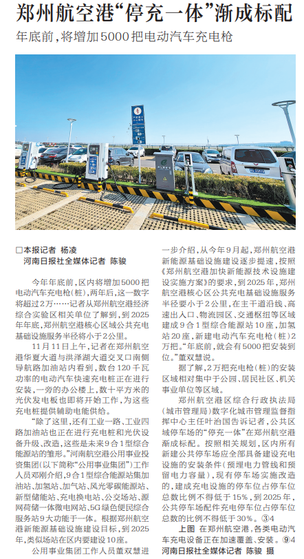 今年年底前,区内将增加5000把电动汽车充电枪(桩),两年后,这一数字将超过2万……记者从郑州航空港经济综合实验区相关单位了解到,到2025年年底,郑州航空港核心区域公共充电基础设施服务半径将小于2公里。(今日《河南日报》3版)