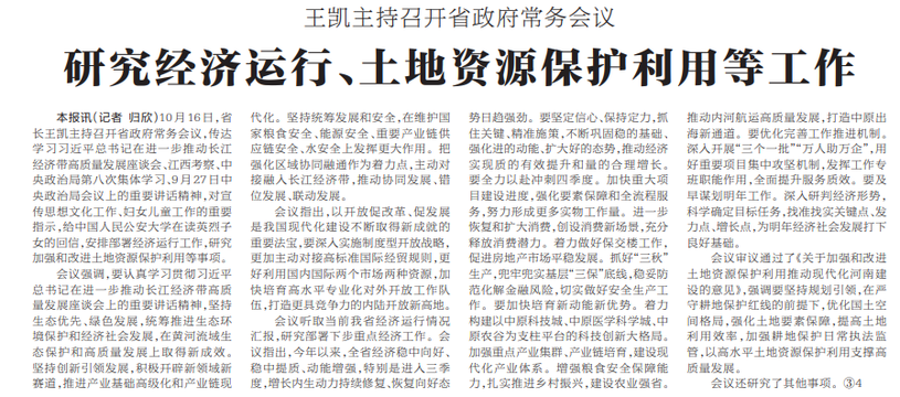10月16日,省长王凯主持召开省政府常务会议,传达学习习近平总书记在进一步推动长江经济带高质量发展座谈会、江西考察、中央政治局第八次集体学习、9月27日中央政治局会议上的重要讲话精神,对宣传思想文化工作、妇女儿童工作的重要指示,给中国人民公安大学在读英烈子女的回信,安排部署经济运行工作,研究加强和改进土地资源保护利用等事项。(今日《河南日报》1版)