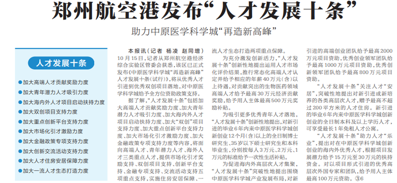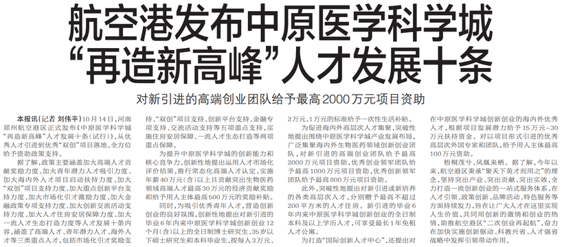 10月14日,河南郑州航空港区正式发布《中原医学科学城“再造新高峰”人才发展十条(试行)》,从优秀人才引进到优秀“双创”项目落地,全方位给予资助政策支持。(今日《郑州日报》7版)