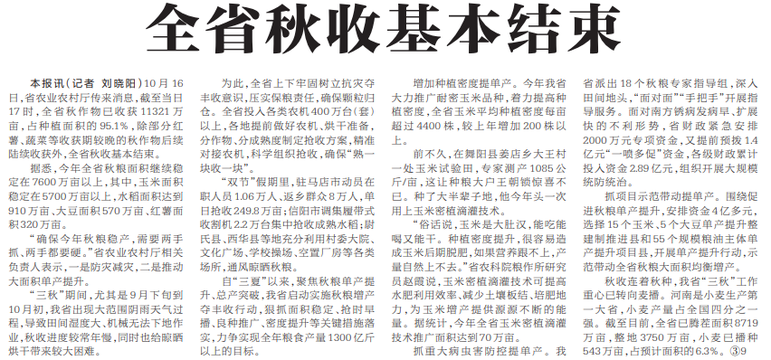 全省秋收基本结束