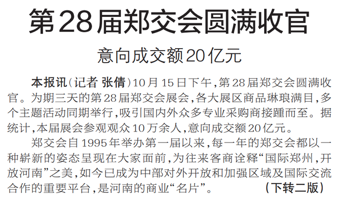 10月15日下午,第28届郑交会圆满收官。为期三天的第28届郑交会展会,各大展区商品琳琅满目,多个主题活动同期举行,吸引国内外众多专业采购商接踵而至。据统计,本届展会参观观众10万余人,意向成交额20亿元。(今日《郑州日报》1版、2版)