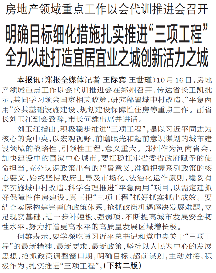 10月16日,房地产领域重点工作以会代训推进会在郑州召开,传达省长王凯批示,共同学习领会国家相关政策,研究部署城中村改造、“平急两用”公共基础设施建设、规划建设保障性住房等重点工作。副省长刘玉江到会致辞,市长何雄出席并讲话。(今日《郑州日报》1版、2版)
