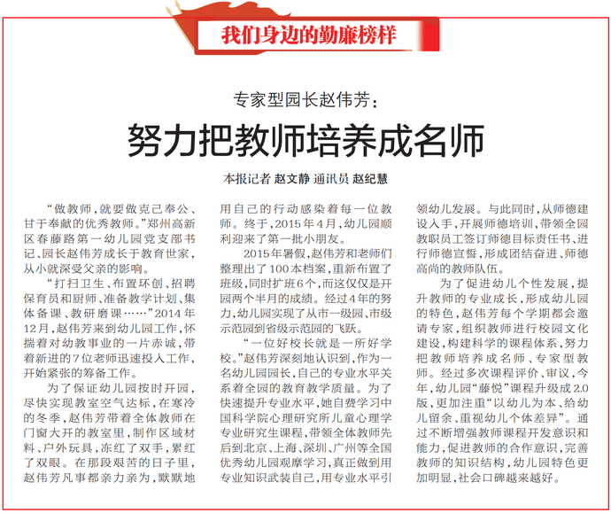 “做教师,就要做克己奉公、甘于奉献的优秀教师。”郑州高新区春藤路第一幼儿园党支部书记、园长赵伟芳成长于教育世家,从小就深受父亲的影响。(今日《郑州日报》2版)