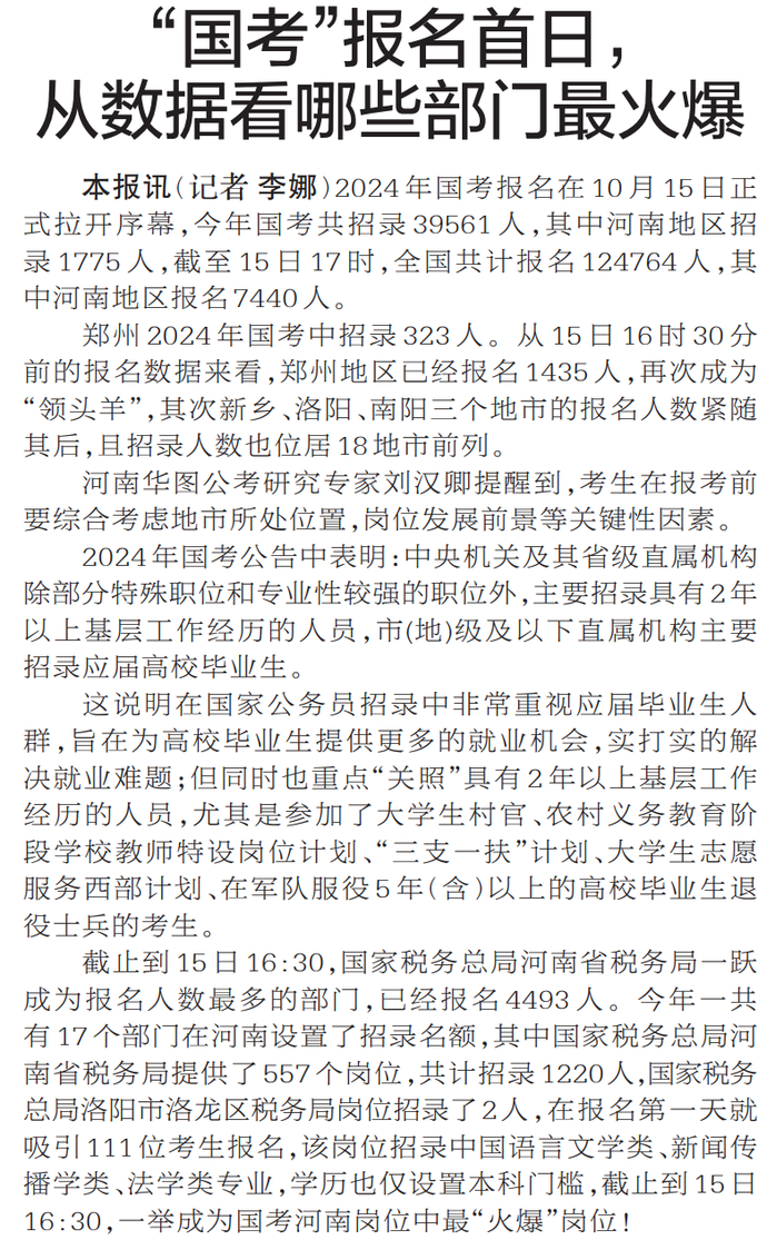 2024年国考报名在10月15日正式拉开序幕,今年国考共招录39561人,其中河南地区招录1775人,截至15日17时,全国共计报名124764人,其中河南地区报名7440人。(今日《郑州日报》2版)