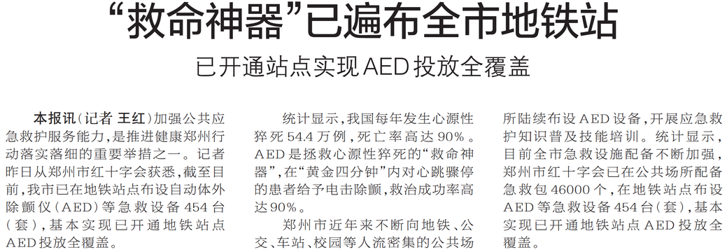 加强公共应急救护服务能力,是推进健康郑州行动落实落细的重要举措之一。记者昨日从郑州市红十字会获悉,截至目前,我市已在地铁站点布设自动体外除颤仪(AED)等急救设备454台(套),基本实现已开通地铁站点AED投放全覆盖。(今日《郑州日报》2版)