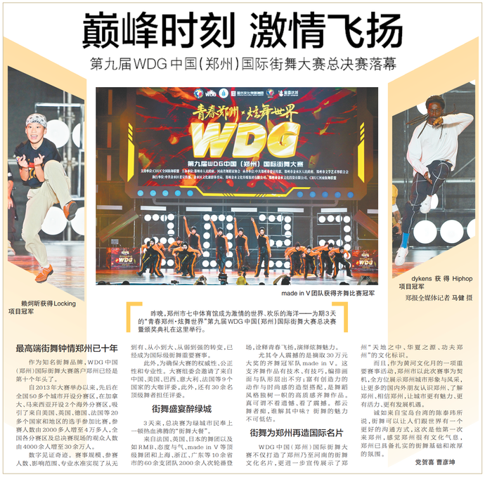 在10月16日晚举行的“青春郑州·炫舞世界”第九届WDG中国(郑州)国际街舞大赛总决赛上,made in V团队以新潮新派的舞技诠释飞扬青春,演绎炫舞魅力,最终获齐舞比赛冠军。(今日《郑州日报》1版、5版)