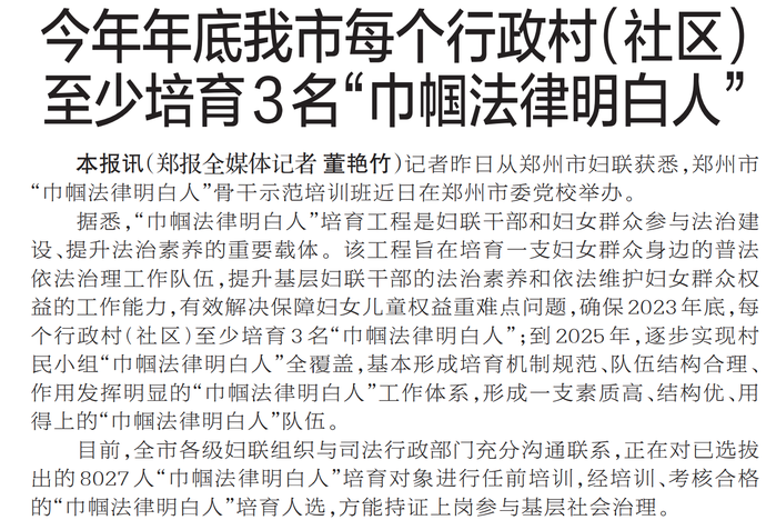 今年年底我市每个行政村(社区) 至少培育3名“巾帼法律明白人”