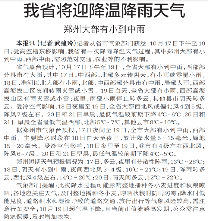 记者从省市气象部门获悉,10月17日下午至19日,受高空槽东移影响,我省有一次降雨降温天气过程,其中郑州大部有小到中雨,西部中雨,需防范对交通、农业等的不利影响。(今日《郑州日报》5版)