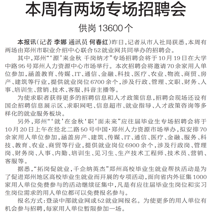 昨日,记者从市人社局获悉,本周有两场由郑州市职业介绍中心联合52就业网共同举办的招聘会。(今日《郑州日报》5版)