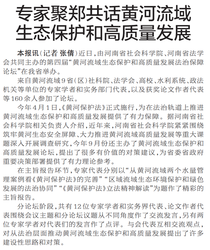 近日,由河南省社会科学院、河南省法学会共同主办的第四届“黄河流域生态保护和高质量发展法治保障论坛”在我省举办。(今日《郑州日报》6版)