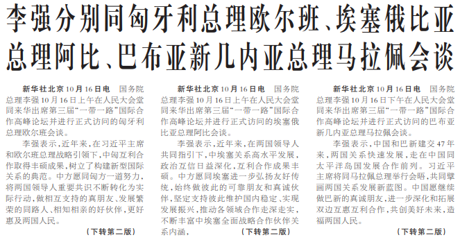 李强分别同匈牙利总理欧尔班、埃塞俄比亚总理阿比、巴布亚新几内亚总理马拉佩会谈