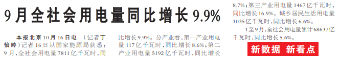 9月全社会用电量同比增长9.9%