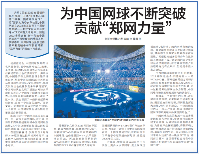 为期9天的2023交通银行郑州网球公开赛10月15日晚落下帷幕。随着中国网球“一姐”郑钦文勇夺女单桂冠,中国网球在2023年又取得了一项新的突破——郑钦文职业生涯首夺WTA500赛女单冠军。回顾2023赛季比赛,新一代的中国网球选手带给我们的精彩不断、突破不断,中国网球也是在这样的不断突破中书写新的精彩,“郑网力量”的贡献不可或缺。(今日《郑州日报》8版)