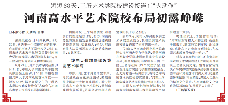 8月30日,河南大学河南戏剧艺术学院院长聘任仪式在河南大学郑州校区举行。省委书记楼阳生出席并讲话,省长王凯颁发聘书。著名京剧表演艺术家于魁智受聘担任河南大学河南戏剧艺术学院院长,著名豫剧演员李树建受聘担任名誉院长。