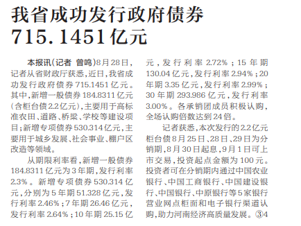 8月28日,记者从省财政厅获悉,近日,我省成功发行政府债券715.1451亿元。其中,新增一般债券184.8311亿元(含柜台债2.2亿元),主要用于高标准农田、道路、桥梁、学校等建设项目;新增专项债券530.314亿元,主要用于城乡发展、社会事业、棚户区改造等领域。(今日《河南日报》2版)