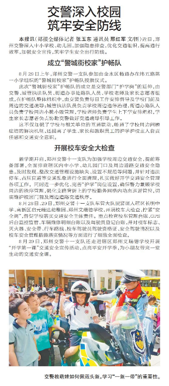 近日,郑州交警深入中小学校、幼儿园,加强隐患排查,优化交通组织,提高通行效率,加强安全宣传,筑牢学生安全出行防线。(今日《郑州日报》5版)