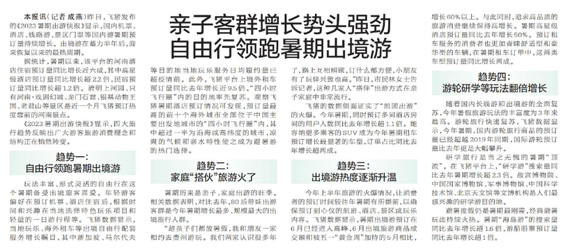 昨日,飞猪发布的《2023暑期出游快报》显示,国内机票、酒店、线路游、景区门票等国内游暑期预订量持续增长。出境游在蓄力半年后,迎来恢复以来的最热周期。(今日《郑州日报》5版)