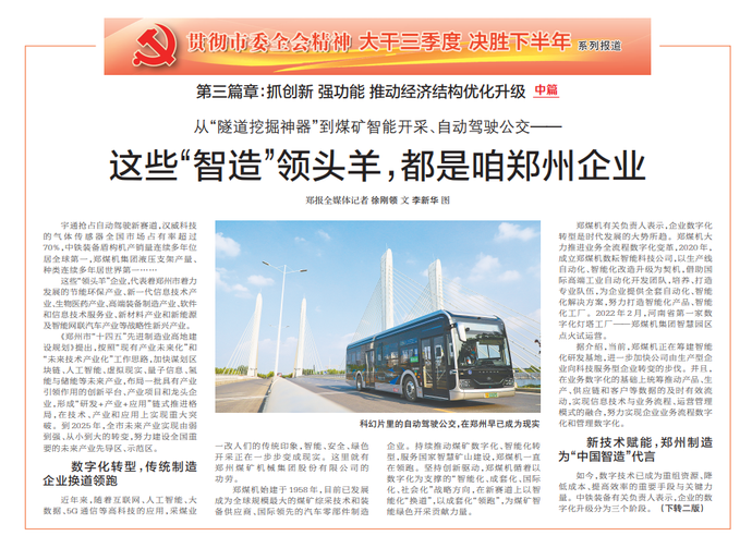 宇通抢占自动驾驶新赛道,汉威科技的气体传感器全国市场占有率超过70%,中铁装备盾构机产销量连续多年位居全球第一,郑煤机集团液压支架产量、种类连续多年居世界第一……(今日《郑州日报》1版、2版)