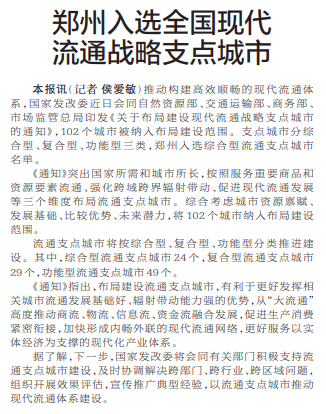 郑州入选全国现代流通战略支点城市