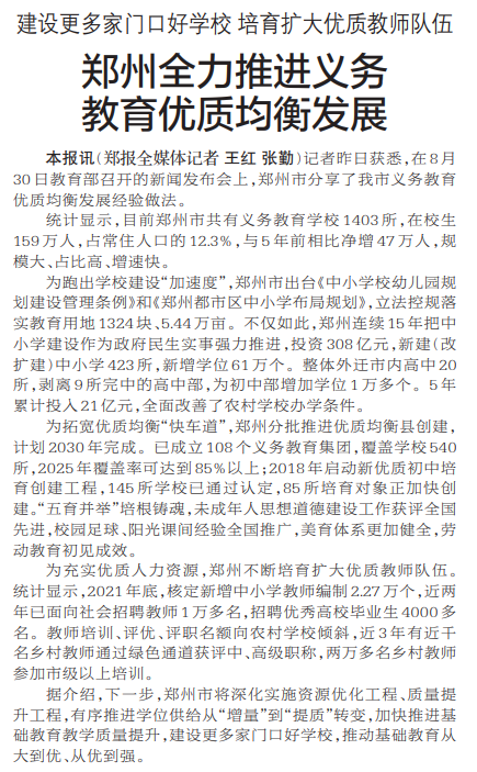 记者昨日获悉,在8月30日教育部召开的新闻发布会上,郑州市分享了我市义务教育优质均衡发展经验做法。