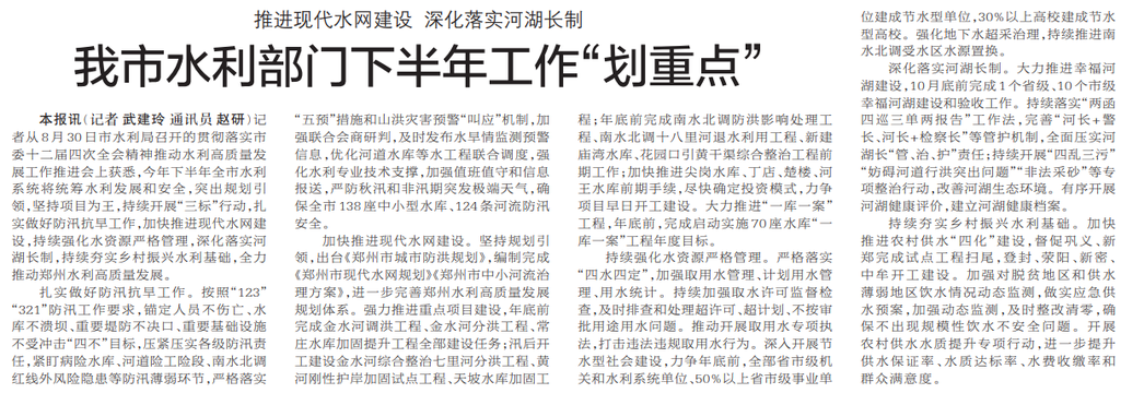 记者从8月30日市水利局召开的贯彻落实市委十二届四次全会精神推动水利高质量发展工作推进会上获悉,今年下半年全市水利系统将统筹水利发展和安全,突出规划引领,坚持项目为王,持续开展“三标”行动,扎实做好防汛抗旱工作,加快推进现代水网建设,持续强化水资源严格管理,深化落实河湖长制,持续夯实乡村振兴水利基础,全力推动郑州水利高质量发展。(今日《郑州日报》2版)