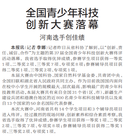 记者昨日从省科协了解到,以“创新、责任、诚信、合作”为主题的第37届全国青少年科技创新大赛终评活动落幕。我省选手取得优异成绩,参赛学生项目获得一等奖1项、二等奖2项、三等奖7项、专项奖8项;参赛辅导员项目获得二等奖1项、三等奖2项、专项奖1项。(今日《郑州日报》2版)