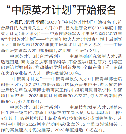2023年“中原英才计划”开始报名了,符合条件的人员请关注。8月30日,省人社厅公布《2023年度中原英才计划(育才系列)——中原技能领军人才申报指南》《2023年度“中原英才计划”——中原青年拔尖人才(中原青年博士后创新人才)申报指南》《2023年度中原英才计划(育才系列)——中原基础研究领军人才申报指南》,对此项工作进行安排。(今日《郑州日报》2版)