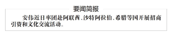 安伟近日率团赴阿联酋、沙特阿拉伯、希腊等国开展招商引资和文化交流活动。(今日《郑州日报》1版)