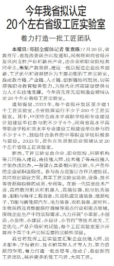 7月26日,省教育厅、省发改委联合印发通知,河南将面向省级开发区内支柱产业和新兴产业,由企业和职业院校共同牵头,集聚产教资源,建设一批以促进企业技术创新、工艺优化和效益提升为主要功能的工匠实验室,推动教育链、产业链、人才链、创新链协同发展,切实增强职业教育服务能力,为现代化河南建设提供有力人才和技能支撑。今年首先在先进制造业领域认定20个左右省级工匠实验室。(今日《郑州日报》1版)