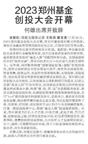 7月26日,2023郑州基金创投大会开幕,市长何雄出席开幕式并致辞。省地方金融监督管理局副局长张云定,市领导张红伟等出席。(今日《郑州日报》1版)