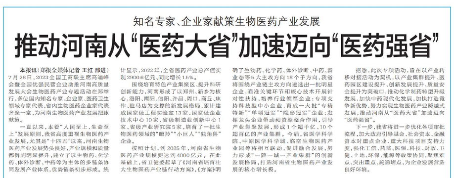 7月26日,2023全国工商联主席高端峰会暨全国优强民营企业助推河南高质量发展大会生物医药产业专题活动在郑举行,多位国内知名专家、企业家、医药卫生领域专家代表、省内生物医药企业家代表齐聚一堂,为河南生物医药产业发展把脉献策。(今日《郑州日报》2版)