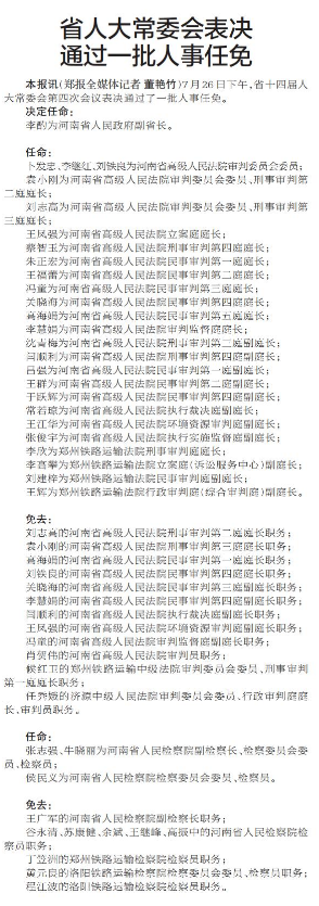 7月26日下午,省十四届人大常委会第四次会议表决通过了一批人事任免。(今日《郑州日报》2版)