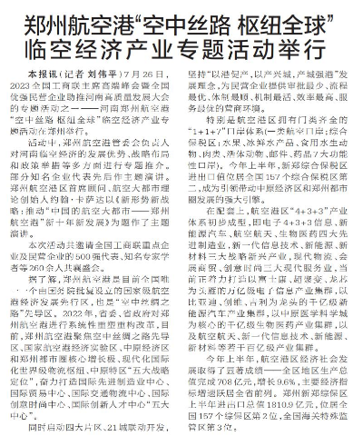7月26日,2023全国工商联主席高端峰会暨全国优强民营企业助推河南高质量发展大会的专题活动之一——河南郑州航空港“空中丝路 枢纽全球”临空经济产业专题活动在郑州举行。(今日《郑州日报》2版)