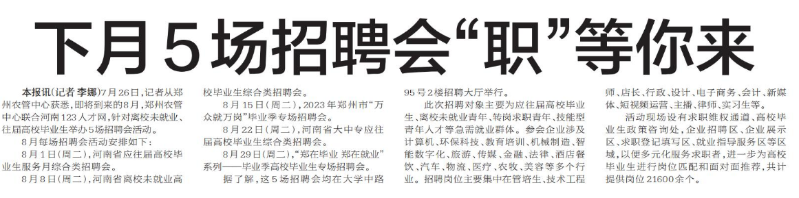 7月26日,记者从郑州农管中心获悉,即将到来的8月,郑州农管中心联合河南123人才网,针对离校未就业、往届高校毕业生举办5场招聘会活动。(今日《郑州日报》5版)
