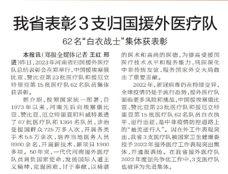 昨日,2023年河南省归国援外医疗队总结表彰会在郑举行,中国援埃塞俄比亚、赞比亚第23批医疗队和援厄立特里亚第15批医疗队62名队员集体获表彰。(今日《郑州日报》5版)