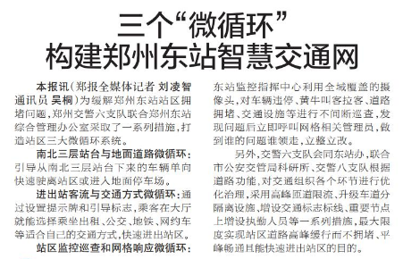 为缓解郑州东站站区拥堵问题,郑州交警六支队联合郑州东站综合管理办公室采取了一系列措施,打造站区三大微循环系统。(今日《郑州日报》5版)