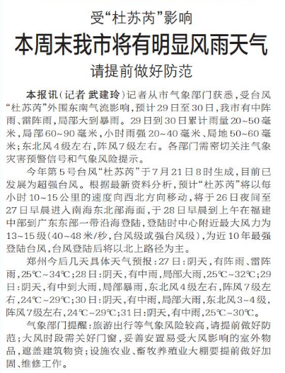 记者从市气象部门获悉,受台风“杜苏芮”外围东南气流影响,预计29日至30日,我市有中阵雨、雷阵雨,局部大到暴雨。29日到30日累计雨量20~50毫米,局部60~90毫米,小时雨强20~40毫米、局地50~60毫米;东北风4级左右,阵风7级左右。各部门需密切关注气象灾害预警信号和气象风险提示。(今日《郑州日报》6版)