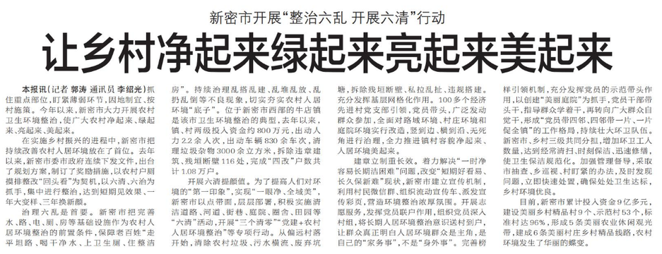 抓住重点部位,盯紧薄弱环节,因地制宜、按村施策。今年以来,新密市大力开展农村卫生环境整治,使广大农村净起来、绿起来、亮起来、美起来。(今日《郑州日报》7版)