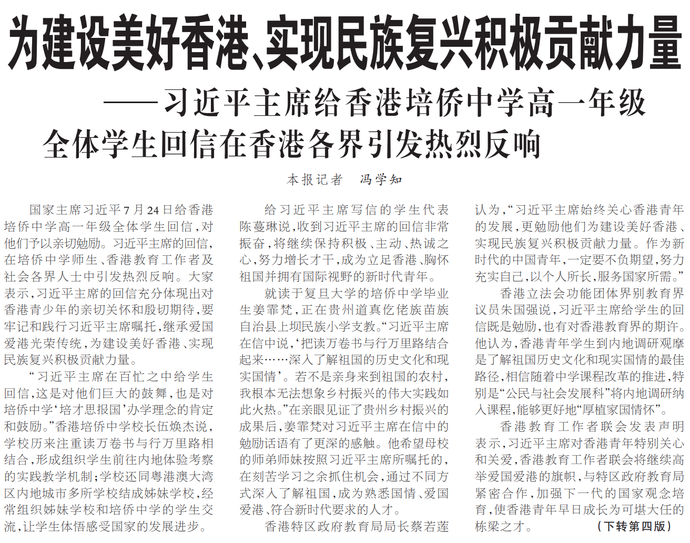 ——习近平主席给香港培侨中学高一年级全体学生回信在香港各界引发热烈反响