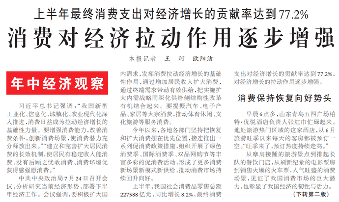 上半年最终消费支出对经济增长的贡献率达到77.2%